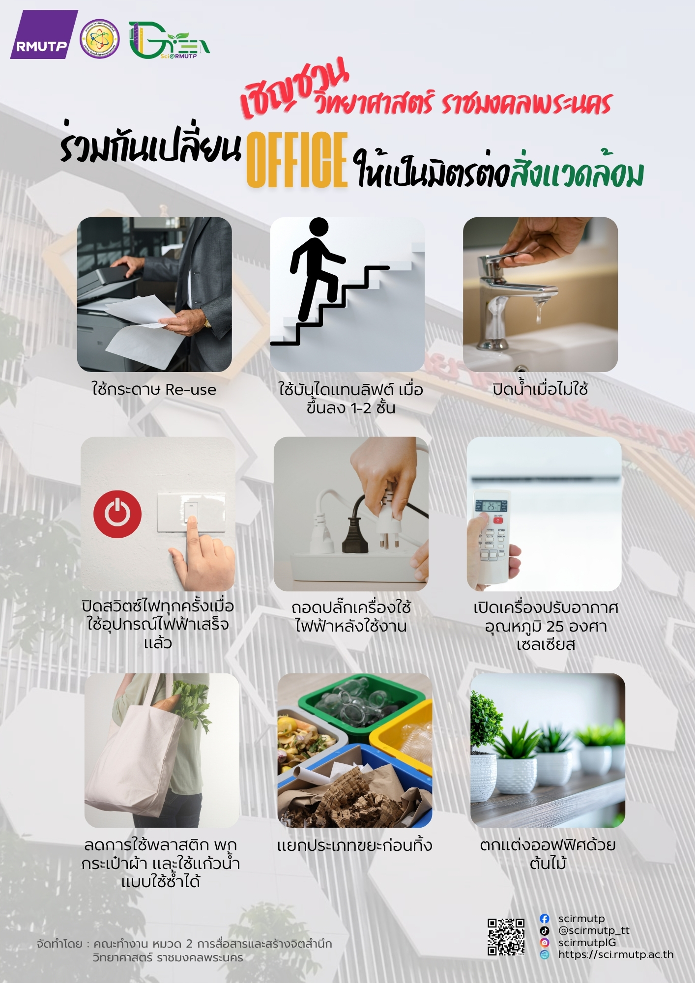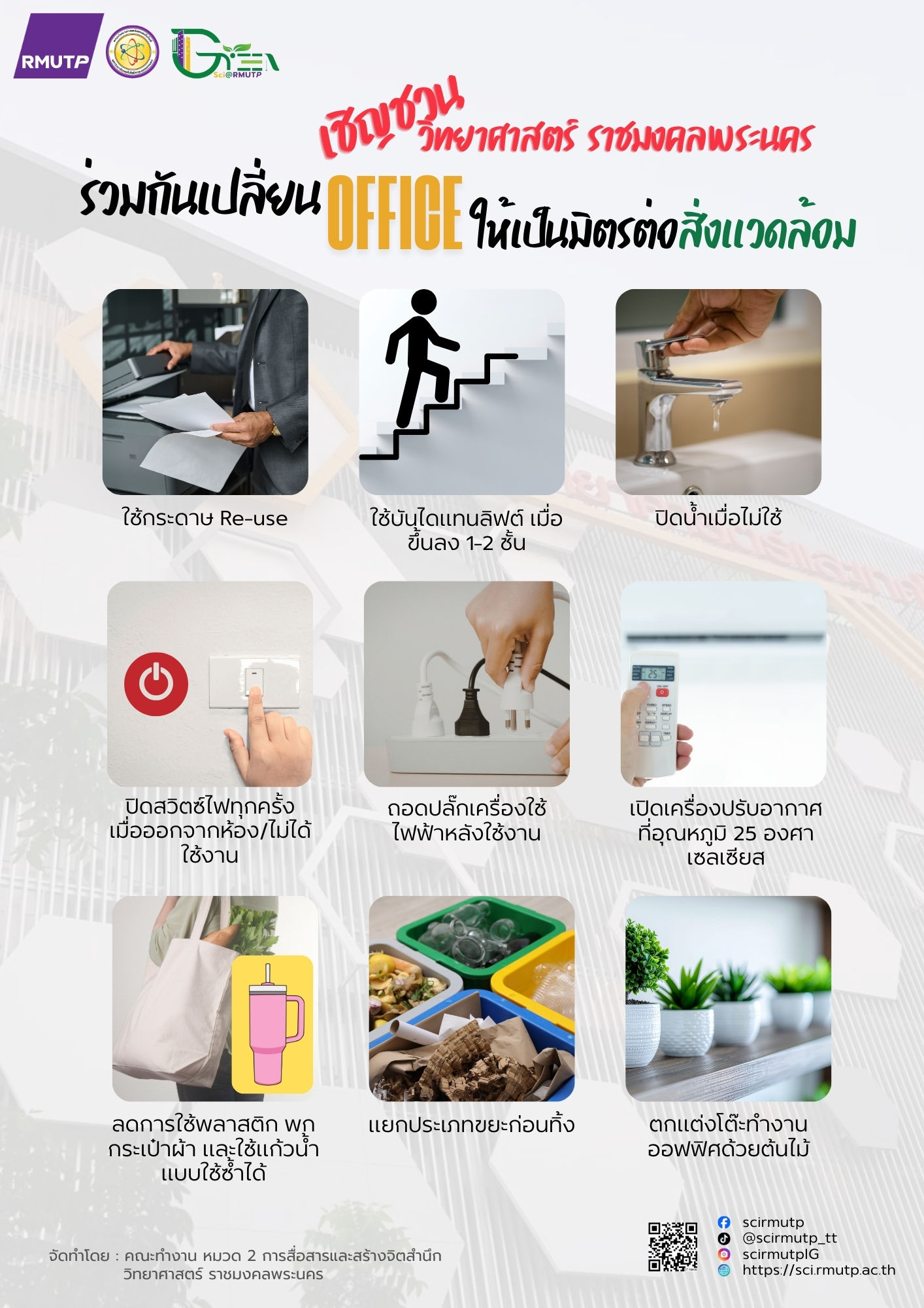 คณะวิทยาศาสตร์และเทคโนโลยี มหาวิทยาลัยเทคโนโลยีราชมงคลพระนคร ขอเชิญชวนคณาจารย์ บุคลากร และนักศึกษา ร่วมกันปรับเปลี่ยนพฤติกรรมในชีวิตประจำวัน เพื่อพัฒนา สำนักงานสีเขียว (Green Office) ที่เป็นมิตรต่อสิ่งแวดล้อม