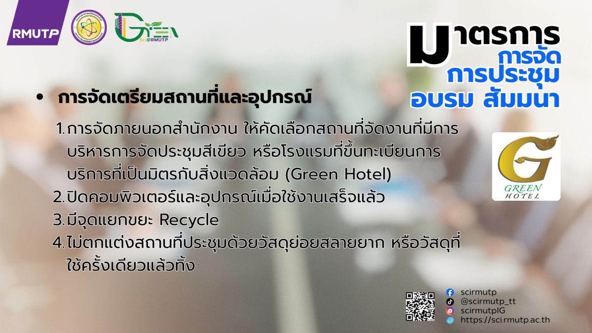 • หากมีการจัดประชุม อบรม หรือสัมมนา ภายนอกสำนักงาน ให้คัดเลือกสถานที่จัดงานที่มีการบริหารการจัดประชุมสีเขียว (Green Meeting) หรือโรงแรมที่ขึ้นทะเบียนการบริการที่เป็นมิตรกับสิ่งแวดล้อม (Green Hotel)