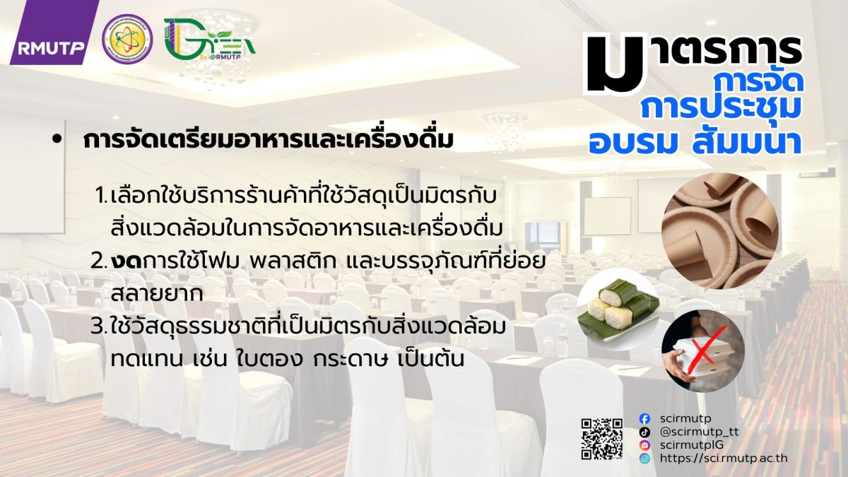 • ไม่ตกแต่งสถานที่ประชุมด้วยวัสดุย่อยสลายยาก หรือวัสดุที่ใช้ครั้งเดียวแล้วทิ้ง