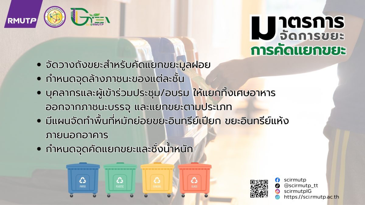 3. บุคลากรและผู้เข้าร่วมประชุม/อบรม ให้แยกทิ้งเศษอาหารออกจากภาชนะบรรจุ และแยกขยะตามประเภทที่กำหนด
