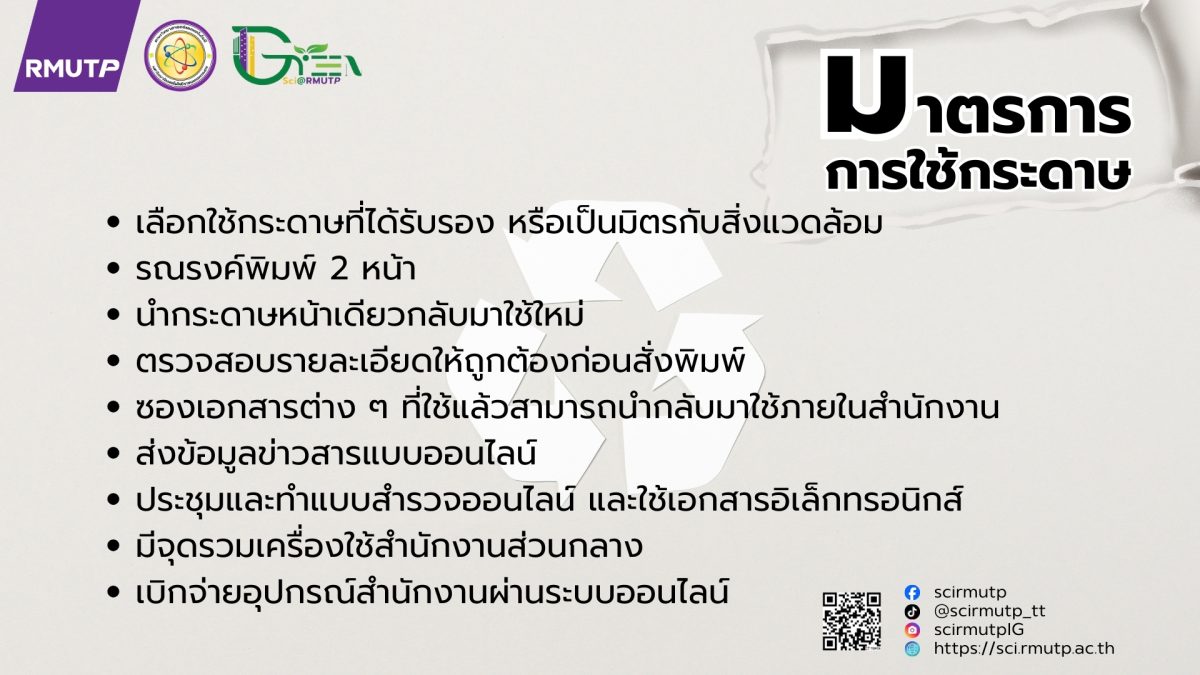 • หากมีความจำเป็นต้องใช้กระดาษ ให้ใช้กระดาษ reuse หรือจัดทำเอกสารโดยการพิมพ์ ๒ หน้า (หน้า-หลัง) และใช้สีขาวดำ