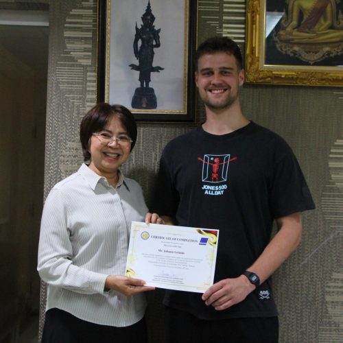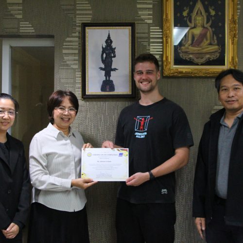 ในโอกาสนี้ ผู้ช่วยศาสตราจารย์เพ็ญนภา สุวรรณบำรุง คณบดีคณะวิทยาศาสตร์และเทคโนโลยี ได้มอบเกียรติบัตรการฝึกงานในโครงการ IAESTE Thailand ให้แก่ Mr. Johann Grimm เพื่อแสดงความยินดีและเป็นขวัญกำลังใจ พร้อมทั้งอวยพรให้นำความรู้และประสบการณ์ที่ได้รับจากการฝึกงานครั้งนี้ไปต่อยอดบนเส้นทางวิชาการและการประกอบอาชีพในอนาคต
