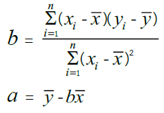 การประมาณค่า a และ b จากข้อมูล (x1, y1), (x2, y2),…, (xn, yn) เพื่อให้ได้เส้นตรงที่เข้ากับข้อมูลได้ดีที่สุด มีวิธีการที่เป็นที่นิยมใช้คือ วิธีกำลังสองน้อยที่สุด (least squares method) วิธีนี้จะให้ค่าประมาณ a และ b ที่ทำให้ความแตกต่างของค่าตัวแปรตามกับค่าที่คาดคะเนได้จากสมการถดถอยมีค่าน้อยที่สุด โดยค่าจุดตัดแกน y (intercept, a) และความชัน (slope, b) ของเส้นถดถอยที่ประมาณด้วยวิธีกำลังสองน้อยที่สุด หาได้ดังนี้